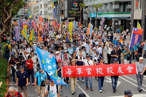 | Des militaires retraités manifestent à Taïwan (Chine) près du Parlement contre la réforme des pensions, le 19 juin à Taipei. |