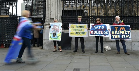 | Un militant pro-UE passe devant des partisans du Brexit devant le Parlement à Londres, le 16 janvier. |