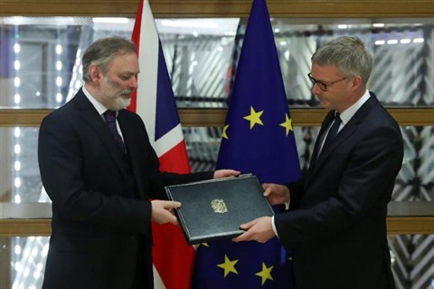 | Le représentant du Royaume-Uni auprès de l'UE, Tim Barrow, remet le document officiel montrant que Londres a rempli ses obligations légales pour sortir de l'UE au Secrétaire général du Conseil européen Jeppe Tranholm-Mikkelsen le 29 janvier à Bruxelles. |