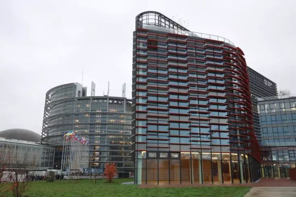 | Vue du Parlement européen et du bâtiment Simone Veil à Strasbourg. |