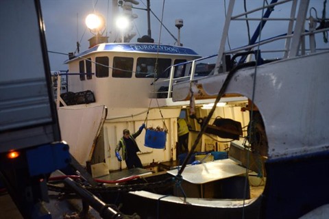 | Déchargement de la pêche à Grimsby (Nord de l'Angleterre) le 9 janvier 2017. |