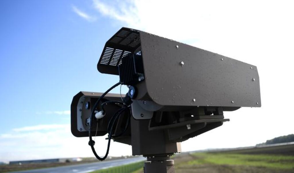 | Thales et CS présentent une caméra, dans le cadre des configurations possibles de leur Système PARADE (Modular anti-drone deployade protection) à Brétigny près de Paris, le 21 octobre 2022. |