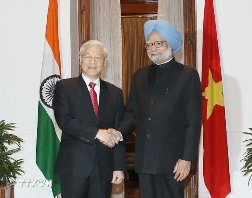 | Le Premier ministre indien Manmohan Singh et le secrétaire général Nguyên Phu Trong (gauche), le 20 novembre 2013 au Palais du Premier ministre à New Delhi. |