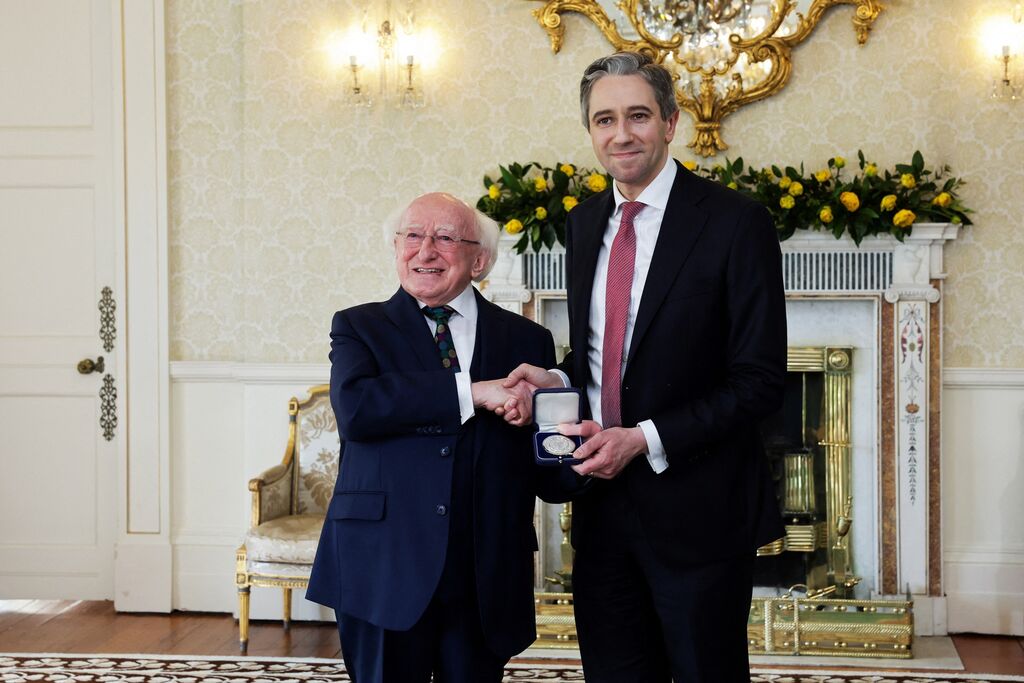 | Le plus jeune Premier ministre de l'histoire irlandaise, Simon Harris (droite), et le président irlandais Michael D. Higgins, le 9 avril à Dublin. |