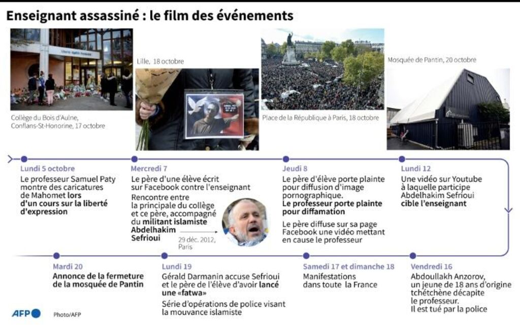 | Chronologie des événements depuis le cours du professeur Samuel Paty sur la liberté d'expression le 5 octobre. |