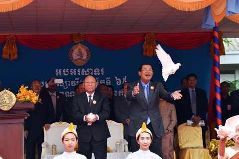 | Heng Samrin (gauche) et Hun Sen lâchent des colombes pour la paix, lors de la cérémonie marquant le 65e anniversaire Parti du Peuple cambodgien. |