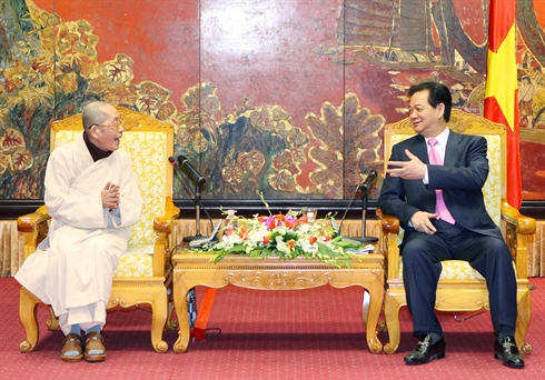 | Le Premier ministre Nguyên Tân Dung (droite) et le vice-président permanent du Comité permanent du Conseil d'administration de l'Église bouddhique du Vietnam, le Vénérable Thich Chon T |