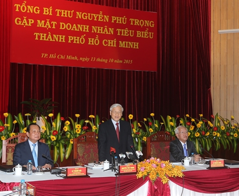 | Le secrétaire général du PCV, Nguyên Phu Trong (debout), prend la parole lors d’une rencontre le 13 octobre avec 129 entrepreneurs modèles de Hô Chi Minh-Ville . |