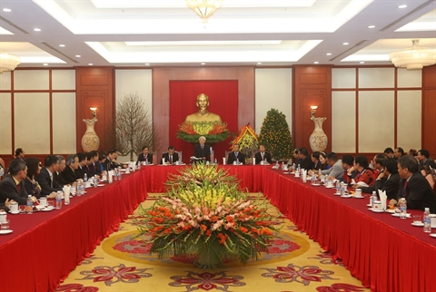 | Le secrétaire général Nguyên Phu Trong reçoit la délégation des représentants de la diaspora vietnamienne, 30 janvier à Hanoi. Photo : VNA/CVN |
