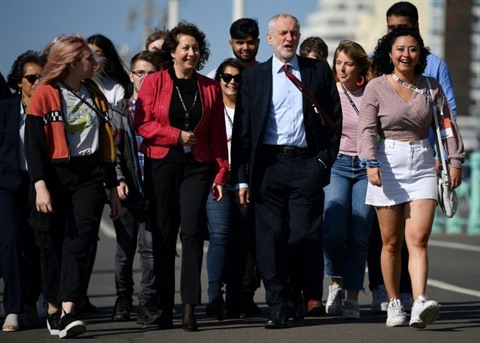 | Le leader du Parti travailliste britannique Jeremy Corbyn (au centre) arrive au congrès de sa formation à Brighton, dans le sud de l'Angleterre, le 21 septembre 2019. |