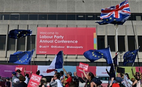 | Manifestation pro-UE devant le lieu du congrès du Parti travailliste britannique, le 21 septembre 2019 à Brighton. P |
