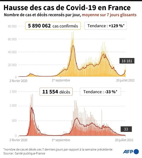 C'est la première fois depuis début mai que le seuil de 20.000 contaminations par jour est dépassé (21.539), contre 9.000 il y a une semaine. Les personnes en soins critiques continuent pour l'heure de baisser (859 contre 931 le 14 juillet).