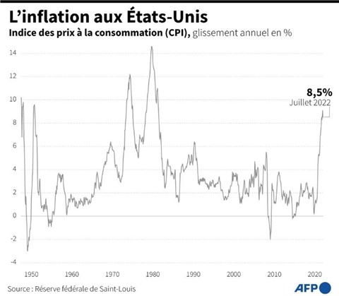 L'inflation aux États-Unis caracolait à 8,5% en juillet sur un an, contre 9,1% en juin, un plus haut en 40 ans, selon l'indice des prix à la consommation CPI. D'après un autre indicateur très observé par la Fed, l'indice PCE, publié vendredi, elle s'est inscrite à 6,3% sur un an en juillet, contre 6,8% en juin.