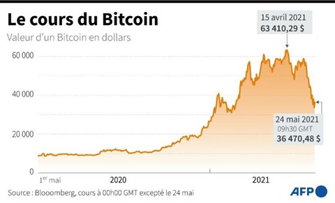 Graphique représentant l'évolution du cours du Bitcoin, du 1er mai 2020 au 24 mai 2021, en USD.