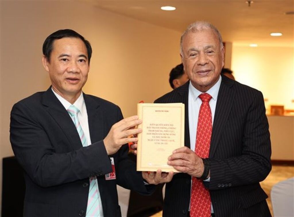 | Le vice-président de la Commission des affaires intérieures du Comité central du PCV, Nguyên Thai Hoc (gauche), offre un livre du secrétaire général du PCV Nguyên Phu Trong au secrétaire général du Parti du Travail du Mexique (PT), Alberto Anaya Guitiérrez. |