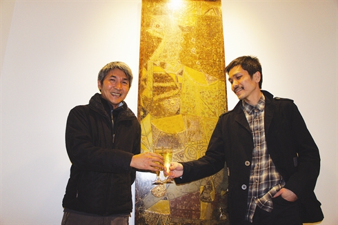 | Le peintre Mai Dac Linh (droite) devant son tableau de nacre Notabilité familiale, de format 60 x 180 cm, présenté à la galerie Victoria à Paris. |