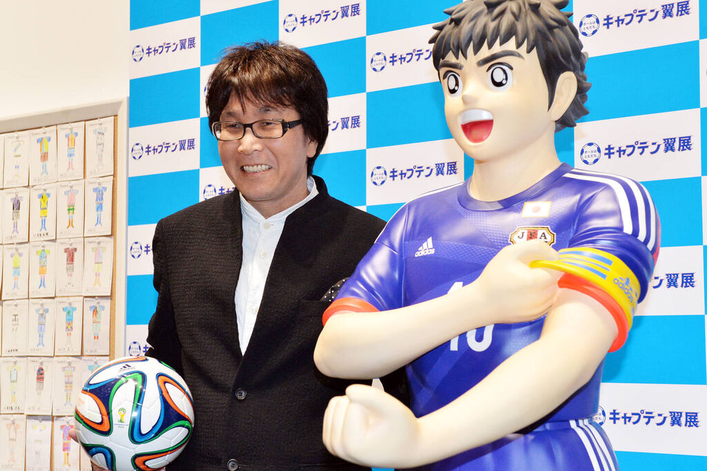 | Le mangaka japonais Yoichi Takahashi pose à côté d’une figurine de son héros Captain Tsubasa. |