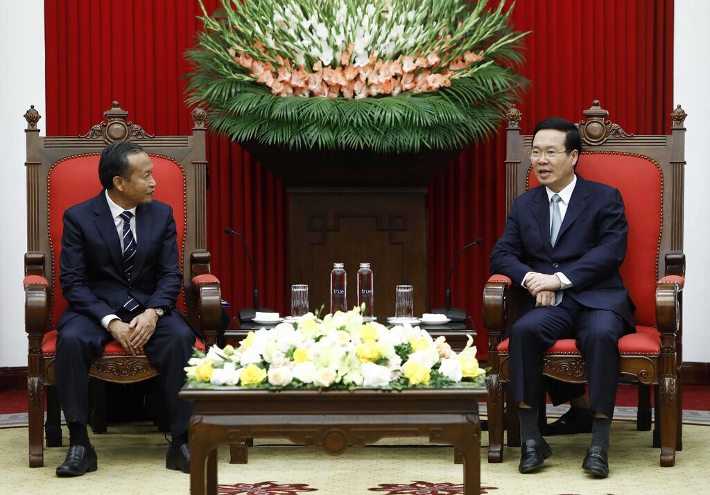 | Vo Van Thuong (droite), permanent du Secrétariat du Parti, et Phouvong Ounkhamxeng, membre du Comité central du Parti populaire révolutionnaire du Laos (PPRL), le 14 novembre. |