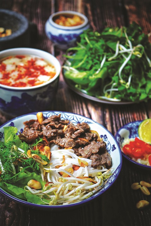 - Nettoyer et couper le filet de bœuf en tranches très fines. Faire mariner avec une cuillère de saumure de poisson et un peu d’ail haché. Laisser reposer pendant 20 minutes.- Nettoyer les pousses de soja, la coriandre et la menthe.- Dans un bol, diluer le sucre dans l’eau, ajouter le jus du citron et la saumure de poisson pour faire une sauce aigre douce.- Faire revenir quelques tranches d’ail avec de l’huile. Faire sauter le bœuf au feu vif pendant quelques minutes.- Dresser un bol avec le pho, les pousses de soja, le bœuf sauté et y verser la sauce. Saupoudrer de cacahouètes torréfiées.- Déguster avec de la salade.