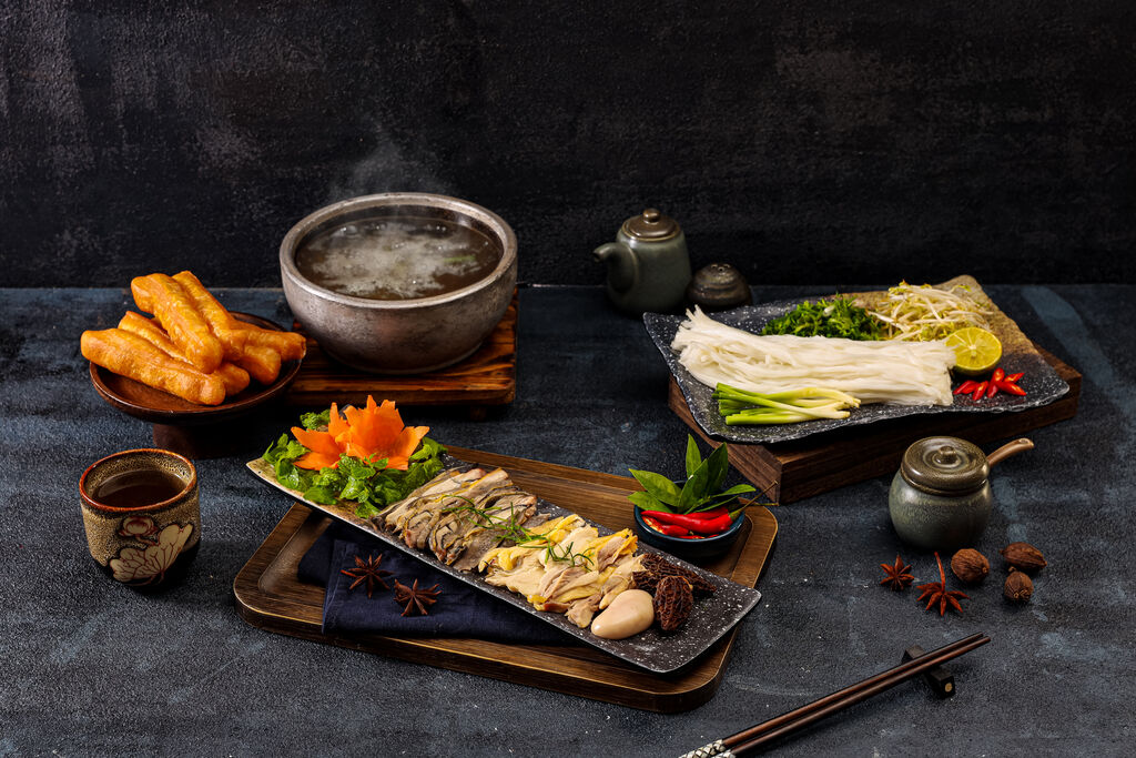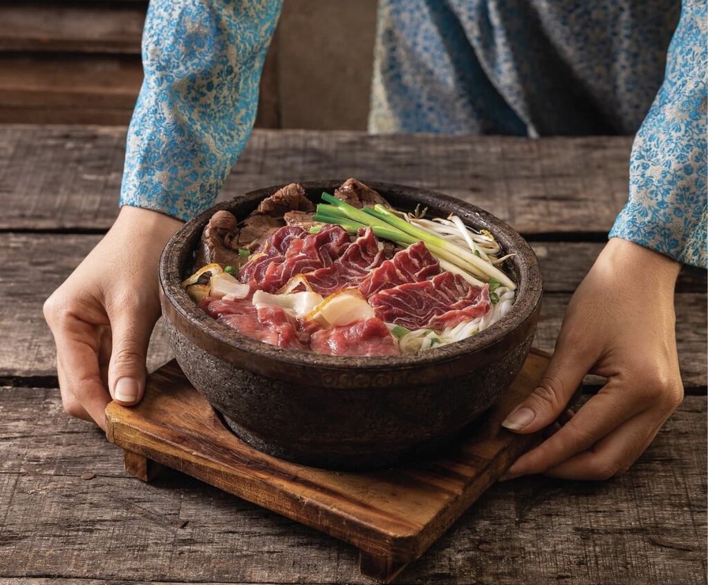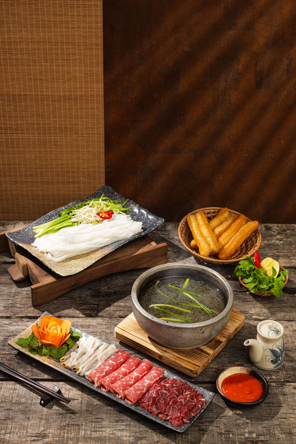 Le plat se déguste alors un peu différemment de sa version traditionnelle. Les convives trempent eux-mêmes les nouilles de riz tendres dans le bouillon que le bol de pierre épais maintient à température constante, ajoutent des lamelles de bœuf ou de poulet crues, puis des oignons verts et des épices pour créer une harmonie de saveurs adaptée à chacun. En le dégustant de cette manière, on distingue encore mieux la tendresse de chaque morceau de viande et la saveur du bouillon sans autres ingrédients.