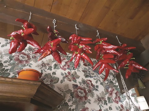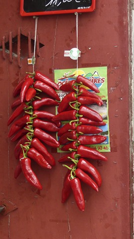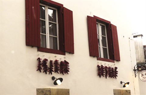 | Guirlandes de piments colorant de rouge les façades des maisons. |