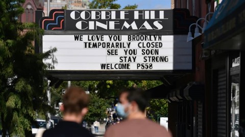 | Des passants devant le cinéma Cobble Hill, fermé depuis des mois à cause de la pandémie, le 8 octobre 2020 à New York. |