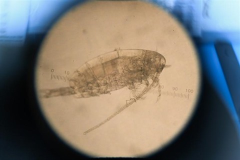 | Représentation d'un échantillon de Calanus helgolandicus, un type de plancton, au siège de l'association de biologie marine à Plymouth, au Royaume-Uni, le 26 août. |