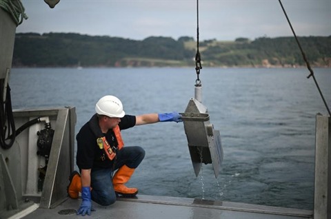| Un membre d'équipage récupère un appareil qui recueille du plancton en continu, au large de Plymouth, au Royaume-Uni, le 26 août. |
