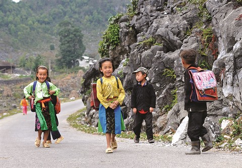| Sur le plateau, les pierres affleurent partout. Les enfants de Dông Van. |