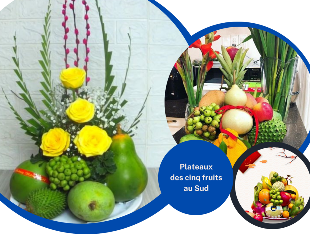 Le plateau des cinq fruits au Sud comporte généralement des noix de coco, des papayes, des mangues et des figues ; prononcé avec l'accent du Sud, cela donne : corossol (Mãng cầu = cầu = prier), noix de coco (dừa = vừa = juste ce qu'il faut), papaye (đu đủ / đủ = suffisant), mangue (xoài = xài = dépenser) et la figue (Sung = Sung túc = aisé), par exemple : "cầu, dừa, đủ, xoài" "prier suffisamment et dépenser modérément" - "cầu, dừa, đủ, sung"...