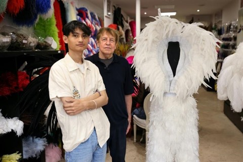 | Dominique De Roo, plumassier officiel du cabaret du Lido avec son assistante, l'artiste népalais Sujan Gurung, dans leur atelier à Paris, le 1er juin. |