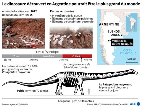 Mais selon les premières analyses, les os de ce sauropode géant de 98 millions d'années, datant du Crétacé supérieur, seraient ainsi "10 à 20% plus grands" que ceux du Patagotitan mayorum, le "Titan de Patagonie", le plus grand dinosaure connu à ce jour, a expliqué le chercheur à la Division de paléontologie des vertébrés du Musée de La Plata (Sud), dans un rapport publié par l'Université nationale de La Matanza.