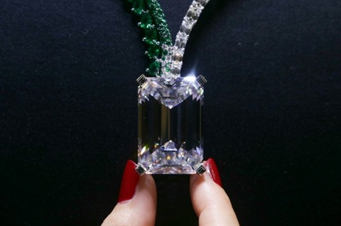 L'extraordinaire diamant de 163,41 carats, sans défaut, suspendu à un collier d'émeraudes et de diamants appelé The Art of Grisogono, a été vendu 33,8 millions de dollars (28,7 millions d'euros), taxes et commissions incluses, a précisé la maison d'enchères.