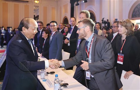| Le Premier ministre Nguyên Xuân Phuc serre la main à un participant étranger du Sommet du commerce et de l'investissement de l'ASEAN 2020 à Hanoï, le 13 novembre. |
