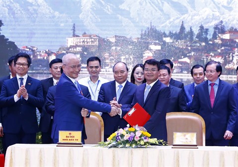 | Le Premier ministre Nguyên Xuân Phuc (centre) assiste à la cérémonie de signature des accords de coopération entre la province de Lào Cai et les investisseurs. |