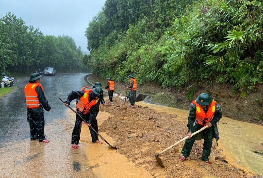 | Les gardes-frontières de la ville de Huê (Centre) creusent des rochers et de la terre, nivelant la surface de la route touchée par un glissement de terrain au col de Pe Ke, commune d'A Luoi 1. |