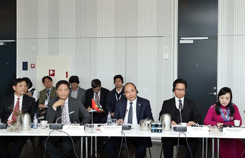 | Le Premier ministre Nguyên Xuân Phuc (centre) lors d'une table ronde avec des entreprises vietnamiennes et danoises, le 20 octobre à Copenhague. |