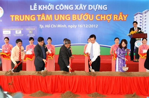 | Le Premier ministre Nguyên Tân Dung (1er plan, 2e à droite), lors de la cérémonie de la mise en chantier du Centre de cancérologie de l'hôpital Cho Rây, le 16 décembre à Hô Chi Minh-Ville. |