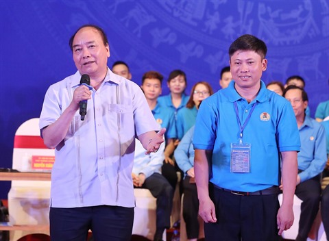 | Le Premier ministre Nguyên Xuân Phuc (gauche) lors d'une rencontre avec un millier d'ouvriers, le 20 mai à Hà Nam (Nord). |