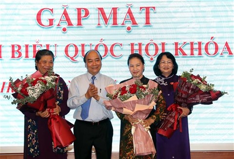 | Rencontre entre le Premier ministre Nguyên Xuân Phuc, la présidente de l'AN, Nguyên Thi Kim Ngân (2e à droite), et des femmes députées, le 10 juin à Hanoï. |