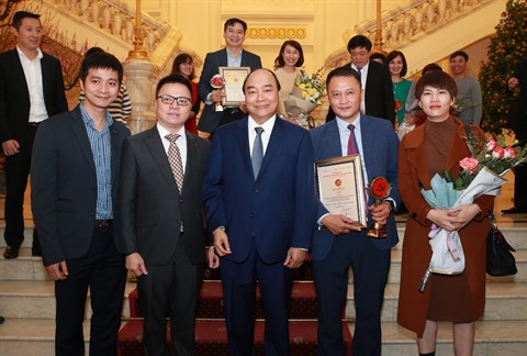 | Le Premier ministre Nguyên Xuân Phuc (centre) et des journalistes lauréats du prix "Marteau et faucille d’or" en 2019, le 15 janvier à Hanoï. |
