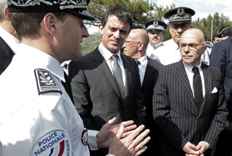 | Le Premier ministre Manuel Valls (centre) et le ministre de l'Intérieur, Bernard Cazeneuve (droite), visitent un commissariat près de la frontière avec l'Italie, le 16 mai à La Turbie. |