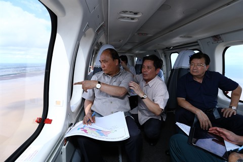 | Le Premier ministre Nguyên Xuân Phuc (gauche) survole le 26 septembre en hélicoptère les zones touchées par les changements climatiques dans le delta du Mékong. |