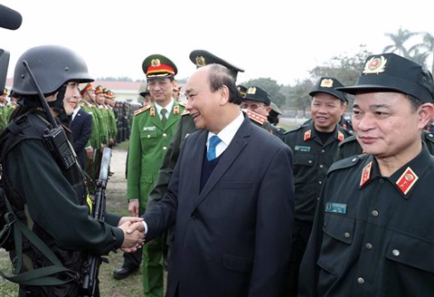 | Le Premier ministre Nguyên Xuân Phuc (centre) rend visite à la force de police mobile relevant du ministère de la Police, le 21 janvier à Hanoï. |