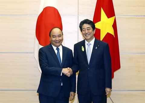 | Le Premier ministre Nguyên Xuân Phuc (gauche) et son homologue japonais Shinzo Abe, le 1er juillet 2019 à Tokyo. |