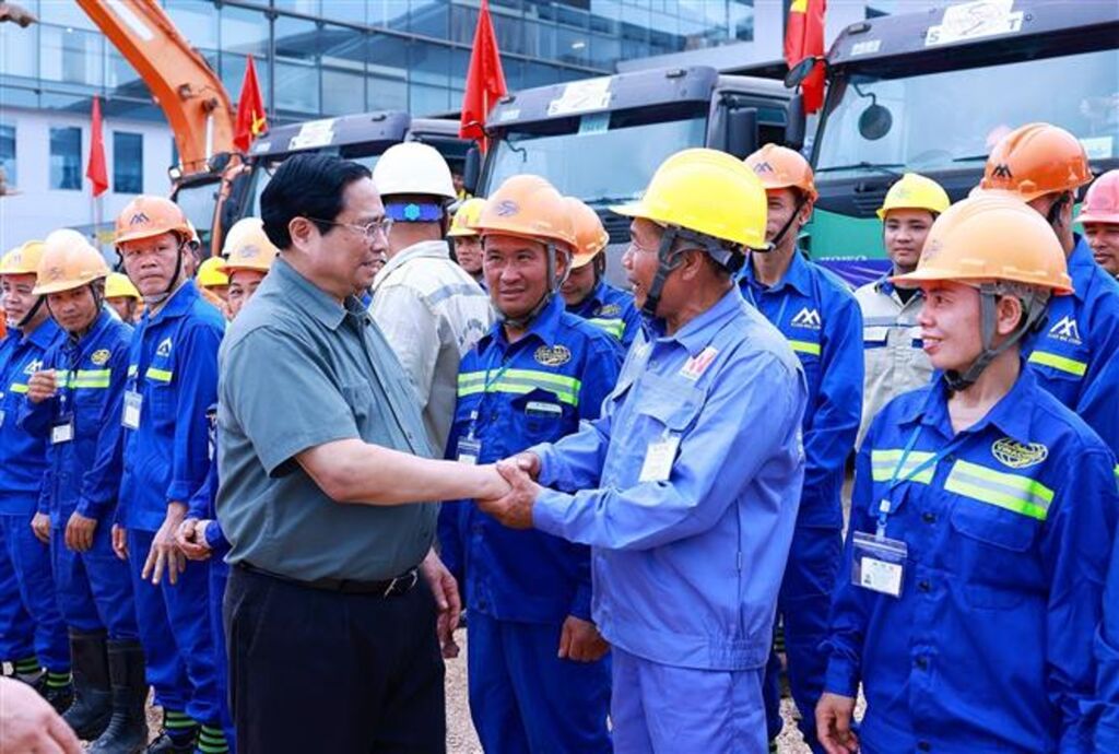 | Le Premier ministre Pham Minh Chinh (gauche) rencontre des ouvriers sur le chantier. |