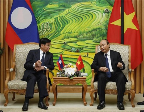 | Le Premier ministre laotien Thongloun Sisoulith (gauche) et son homologue vietnamien Nguyên Xuân Phuc, le 14 août à Hanoï. |