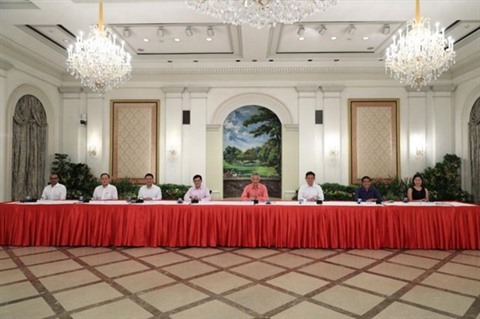 | La conférence de presse tenue le 25 juillet où le Premier ministre Lee Hsien Loong (centre) annonce le nouveau cabinet. |
