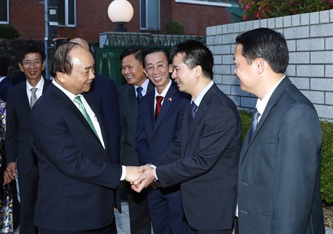 | Le PM Nguyên Xuân Phuc (premier à gauche) rencontre des cadres de l'ambassade du Vietnam et des représentants de la communauté vietnamienne au Japon le 4 juin. |