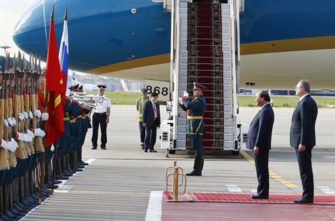| Cérémonie d'accueil en l’honneur du PM Nguyên Xuân Phuc, le 21 mai à l'aéroport Vnukovo 2 de Moscou. |